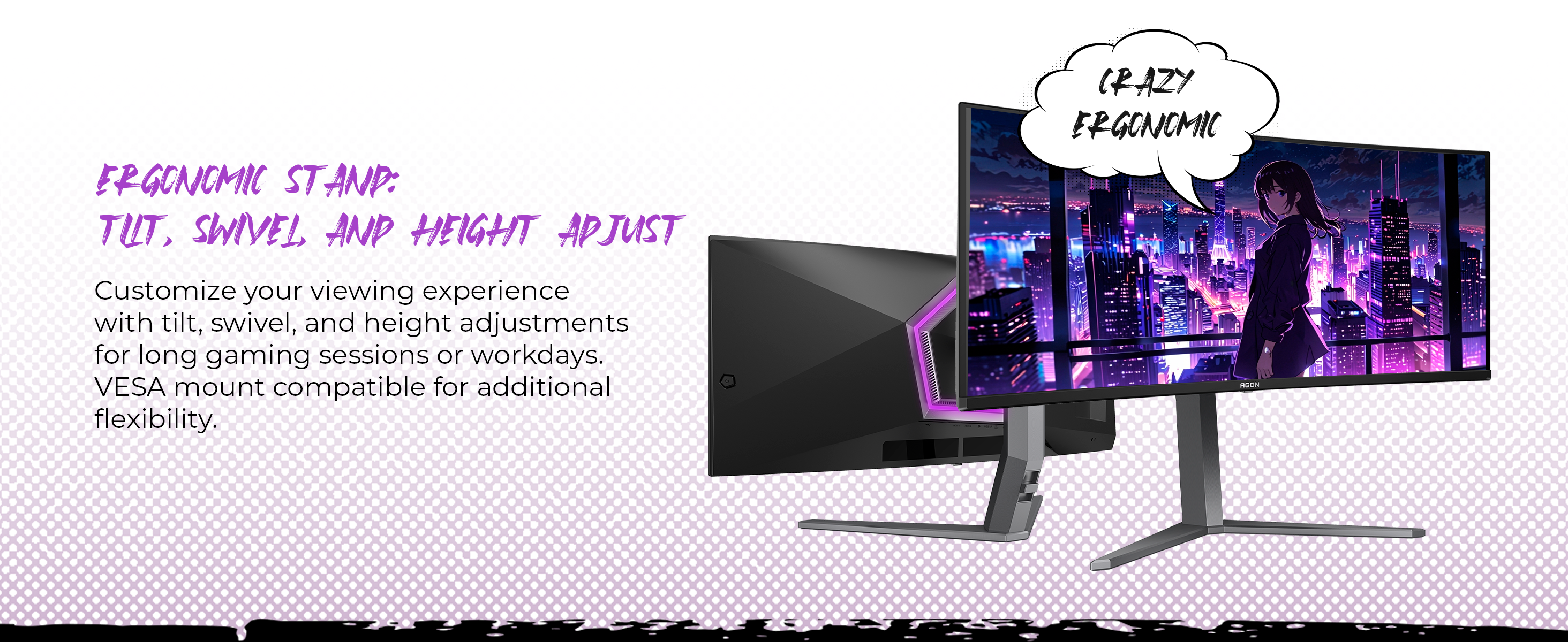 - Ergonomic Stand with height, tilt, and swivel adjustments